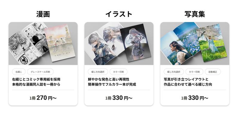 しまうま出版では、初心者の方でも用紙・レイアウトに悩まずに冊子を作れるように、「漫画」「イラスト」「写真集」の3種類の商品バリエーションをご用意。作成したい冊子の特徴に合わせてお選びいただけます。
