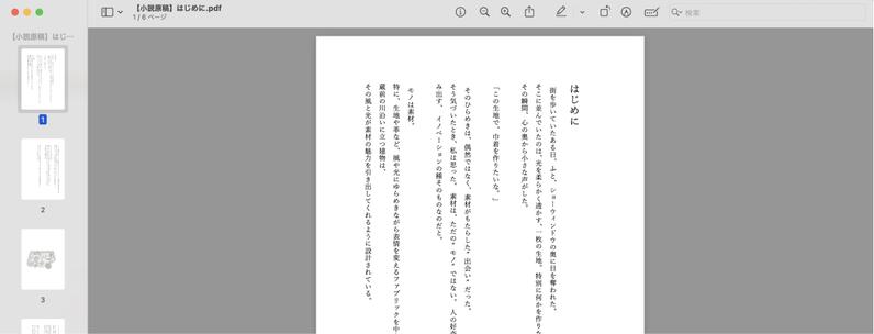 「第1章 はじまり」など、章タイトルページを作ると本らしい仕上がりになります。